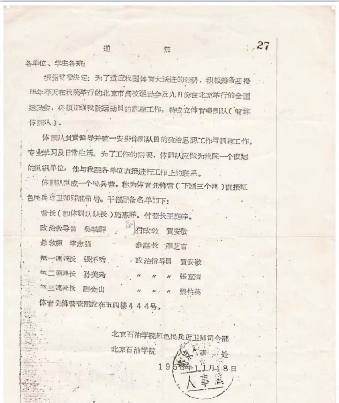 1958年11月18日,北京石油学院下达文件成立体育先锋营(简称体训队)