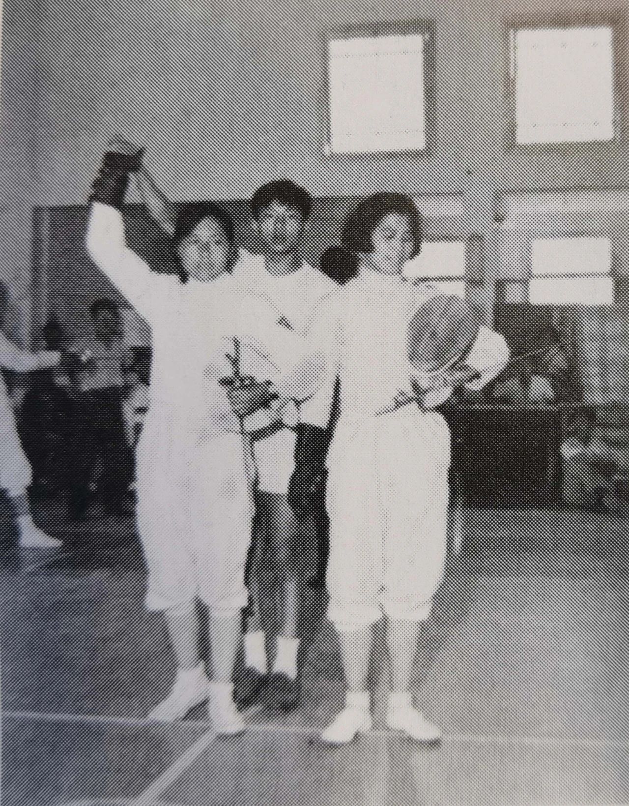 1960年北京北郊高校击剑冠军赛胡世军(左一)获女子花剑冠军,高淑玫(右一)获亚军