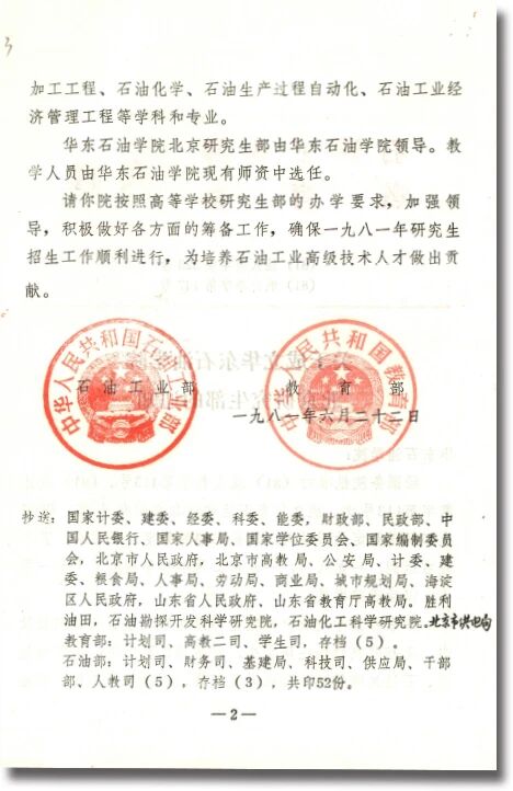1977年10月、1978年1月,国务院、教育部分别下发关于研究生招生的文件,要求有条件的高校要积极招收研究生。1981年,学校获准在北京原校址内成立华东石油学院北京研究生部,并于同年开始正式招生。