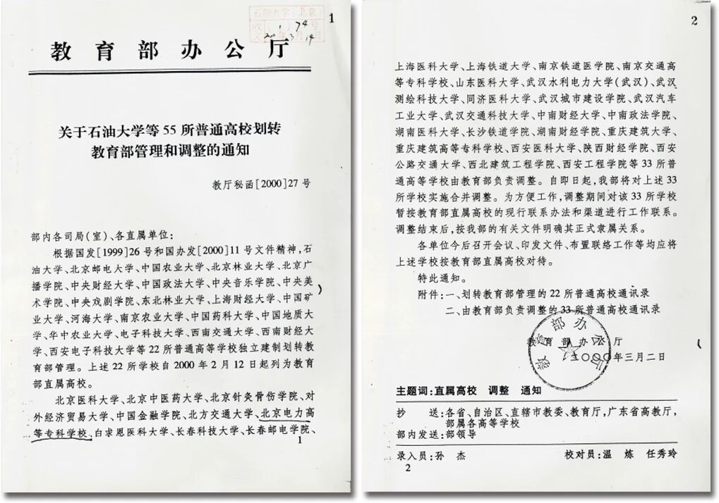 2000年1月29日,教育部、国家计委、财政部批准了石油大学整体“划转教育部管理”。学校从行业办学转变为国家宏观管理的学校自主办学,学校迎来了发展的宝贵机遇。