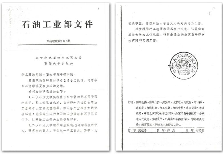 1988年2月,国家教委向石油工业部、山东省和北京市人民政府发出《关于同意华东石油学院更名为石油大学的通知》。1989年,学校恢复招收本科生,10月,石油大学(北京)正式开学。