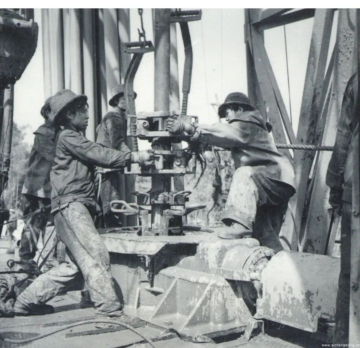 北京石油学院学生段功武(戴白色安全帽者)和铁人王进喜一起战井喷