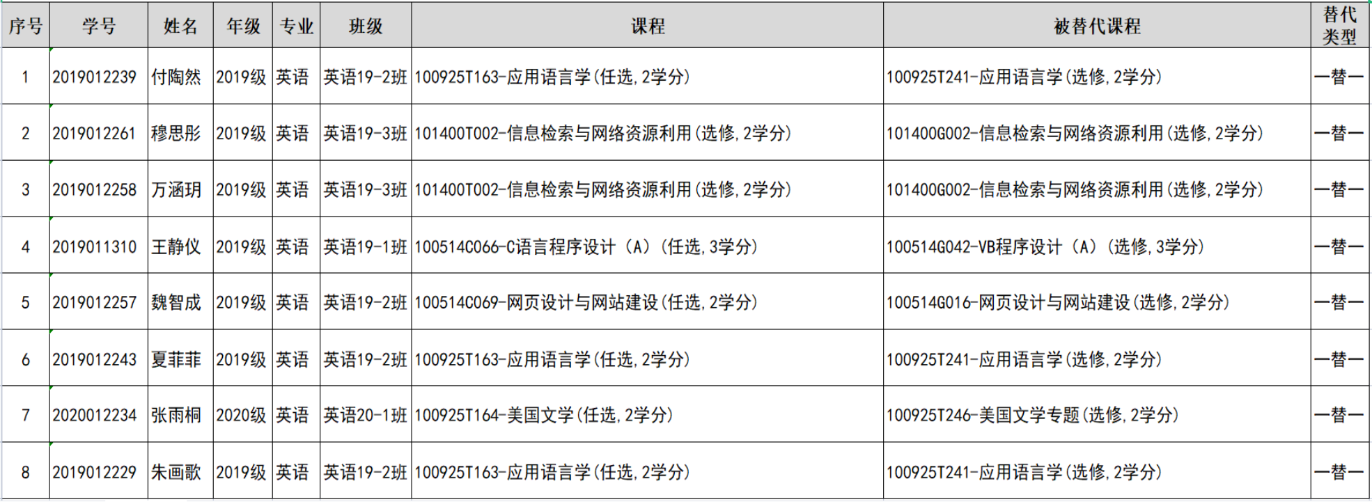 根据教务处通知要求,现对本科生申请办理课程替代情况公示如下: