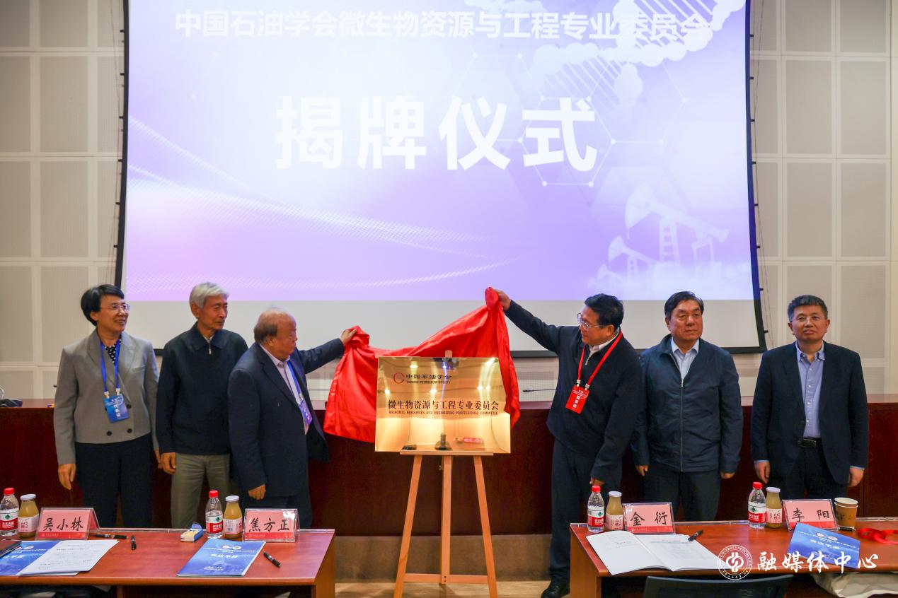 中国石油学会理事长焦方正、中国工程院院士胡文瑞、中国工程院院士李阳、生态环境部原总工杨朝飞、中国石油大学(北京)原校长吴小林和中国石油大学(北京)校长金衍,共同为中国石油学会微生物资源与工程专业委员会揭牌。