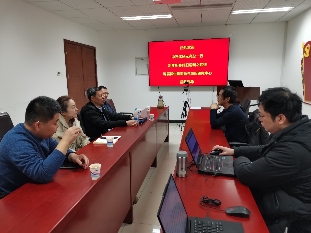 万云洋对胜利油田在岁末辞旧迎新之际踏着大寒之时、对杨总一行再次莅临地微中心指导工作表示热烈欢迎和由衷感谢,向来宾简要汇报了地微中心2024年筹建中国石油学会微生物资源与工程专业委员会的情况,向各位专家介绍了全球首次超(特)稠油微生物降黏增效、首口页岩油微生物措施井提质增效、各类硫化氢原位治理持续见效、油气微生物勘探新技术及其应用等案例进展,简要介绍了聚合物保黏降黏、石油全闭环循环等一些新的储备技术。