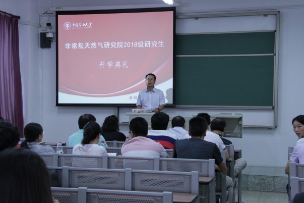 8月29日上午,非常规天然气研究院在二教212举行2018级新生开学典礼。院长宋岩教授,直属党支部书记、副院长姜振学教授,周福建教授等17位研究院教师,以及研究院办公室吴雪飞老师,研究院辅导员戴金明老师共同出席了典礼。典礼由姜振学副院长主持。