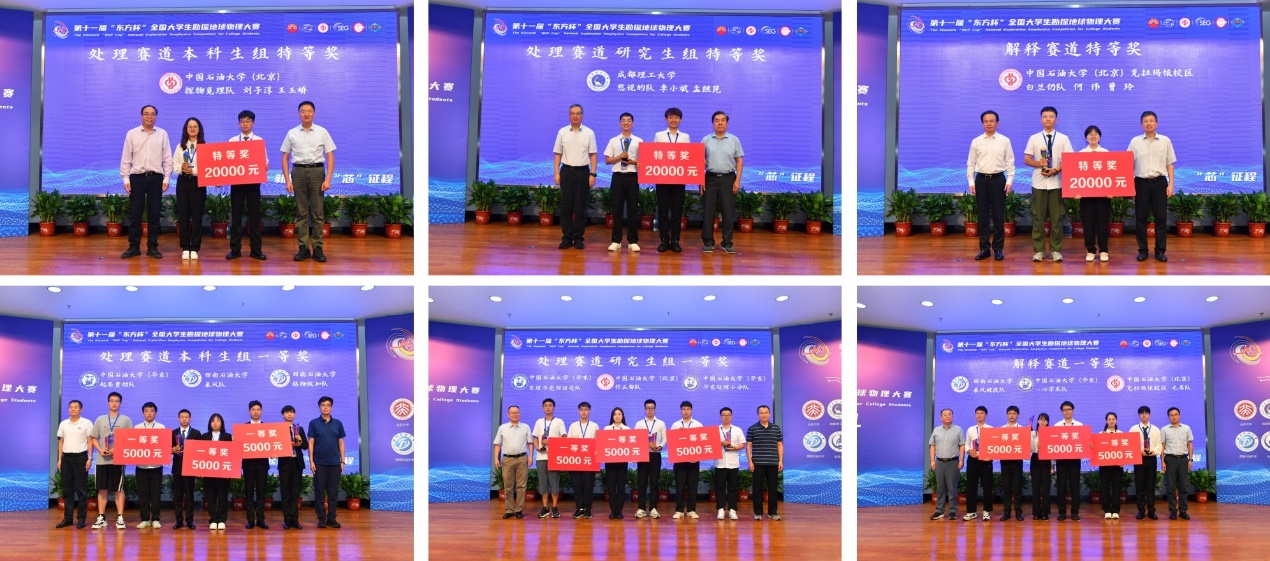 来自中国石油大学(北京)的探物觅理队和成都理工大学的您说的队分别获本次大赛处理赛道本科生组和研究生组特等奖,来自中国石油大学(北京)克拉玛依校区的白兰仍队荣获解释赛道特等奖,来自中国石油大学(北京)、中国石油大学(华东)、西南石油大学等单位的9支团队荣获一等奖,30支团队获得二等奖、48支团队获得三等奖。