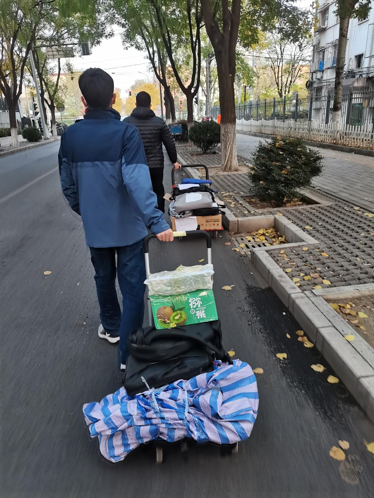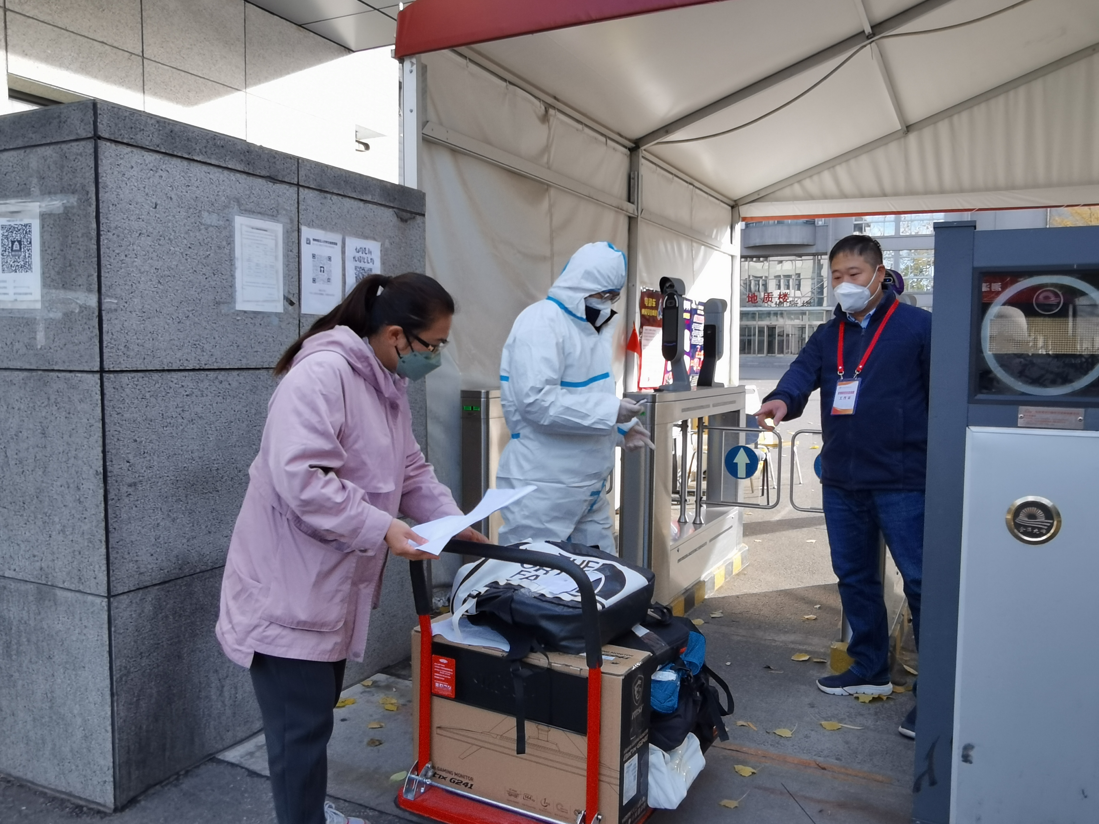 鉴于此次校园封控事发突然,很多学生的电脑等学习用品还存放在学生工作室,学院党委牵头,辅导员和院办职员等老师迅速行动,组建了一支搬运队伍,辅导员组织校内学生帮忙打包学生物资,院办职员等老师在校外接应,在徐静老师的带领下,老师们及时将学生所需物资送到学生所在校区。徐静老师多次往返于南校园和东校园,不仅为封控学生转运物资,还为在校教师及时补充防疫物资等生活用品。