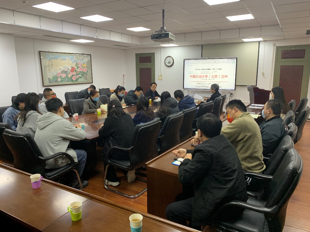 首先,姜福杰传达了学校实验室安全管理座谈会的精神和要求,强调了实验室安全管理的重要性,要求各实验室对实验设备安全、实验室人员操作安全要有严格的培训和把控。随后,师生宝老师对3月份实验室安全检查结果做了通报,并提出了实验室按照危险性等级进行分级管理的举措。会上,师生宝老师解读了《2022年度高校实验室安全检查&实验室自查自纠安排》通知的相关要求,并带领大家一同学习了中国石油大学(北京)关于印发《安全生产管理规定(试行)》的文件。