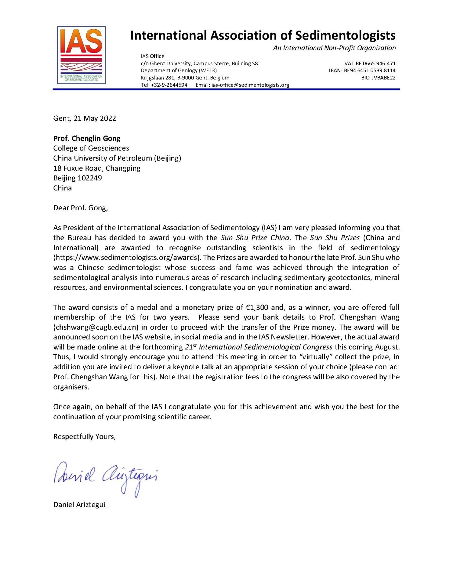 近日,国际沉积学家协会(IAS)公布了2022年度孙枢奖(SUN SHU Prize)获奖人,我院青年教师龚承林教授荣获该奖。