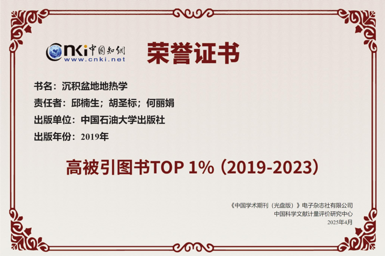 本次所发布榜单以2019—2023年我国出版图书为评价对象,从约5.9万种学术著作及1.1万种译著入选待评书目中,以中国知网收录的期刊论文、会议论文和博硕士学位论文为引证统计源,以被引频次为统计指标,经定量遴选和两轮同行评议,评选出17个学科领域共637种高频被引图书书目,形成“高被引图书Top 1%(2019-2023)”榜单。《沉积盆地地热学》的入选,反映了我院地热资源领域教学、科研在国内的重要影响力。
