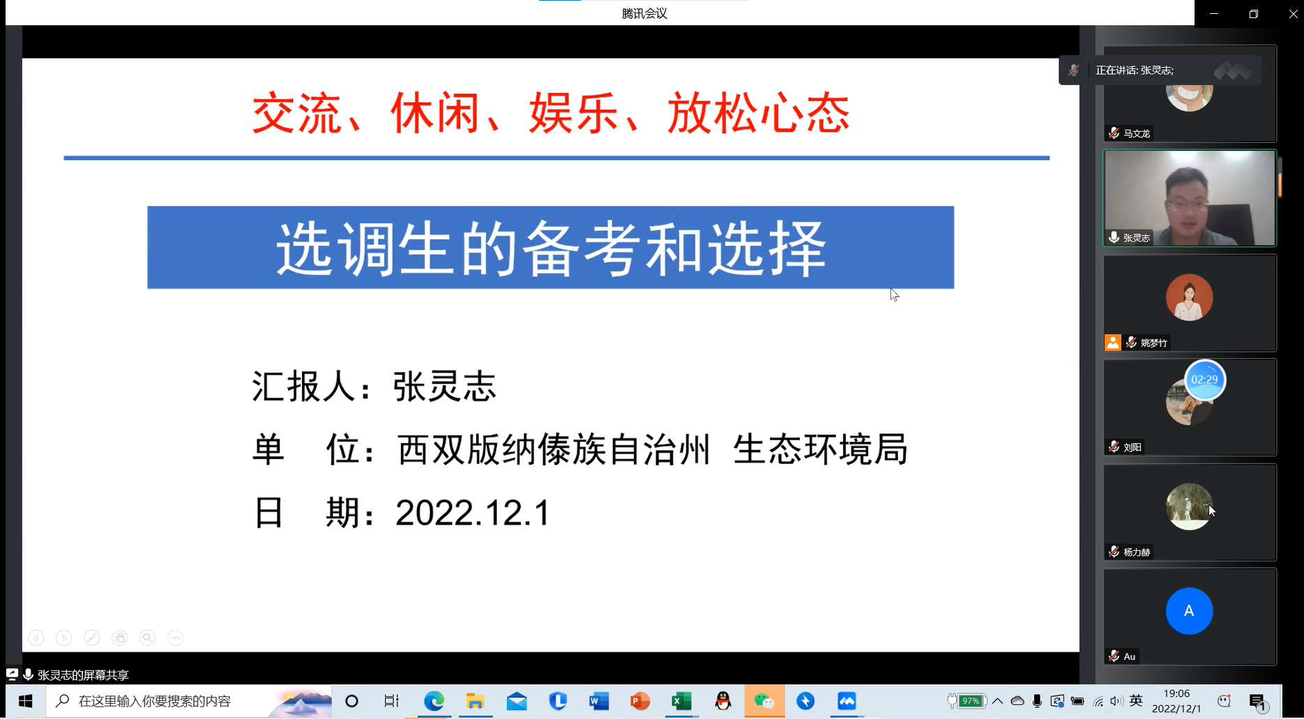 张灵志,男,化学工程与技术博士研究生,云南省2022年定向选调生,入职于西双版纳州生态环境局。 分享主题:选调生的备考和选择。 张灵志首先为同学们简单介绍了个人毕业时的求职经历,其次为同学们讲解了什么是选调生,以及选调生的政策是什么,让同学们对选调生有了一定的认识,从而为大家进一步的深入了解做铺垫。接着,张灵志为同学们讲解了选调生和公务员考试招录的共同点和差异点,首先共同点是工作性质都为办文、办事、办会;不同点在于选调生需要2年基层轮岗锻炼以及组织部跟踪培养,张校友总结到二者既有区别又没什么区别,平常心最重要!接着,张校友为同学们详细讲解了如何备考选调生,第一要学好行测、申论和公共基础知识;第二要投入充足的时间准备考试内容,充分利用网络上的课程资源;第三,要对面试做充足的准备,建议线下报面试培训班。分享的最后,张校友为大家分享了自己参加选调生工作的体会,首先选调生是一份工作,一个选择,它待遇稳定,上班时间不稳定,要坚定理想信念,不忘初心,树立红线意识;其次对待工作要脚踏实地,调整好心态;最后张校友勉励同学们在找工作是要放平心态,积极向上,缘分天注定!