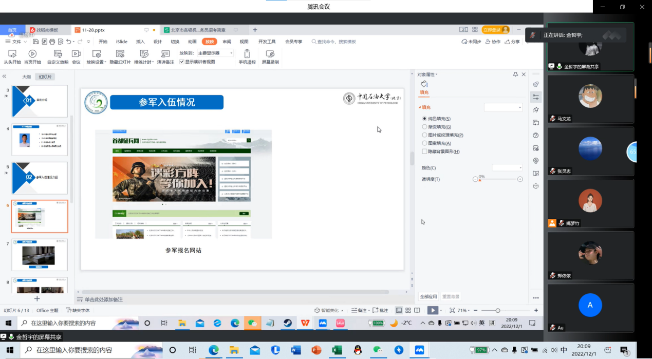 金哲宇,中共党员,本科毕业于北京林业大学,19-21服役于海军某部,现石景山区古城街道执法队队员,分享主题:参军入伍及公务员备考经验分享。金哲宇首先为同学们介绍了自己大学时期的军旅生涯,讲解了参军入伍的一些优势;其次为同学们讲解了退役大学生士兵报考公务员相关的政策,以及符合相关条件大学生士兵的一些就业方向推荐。
