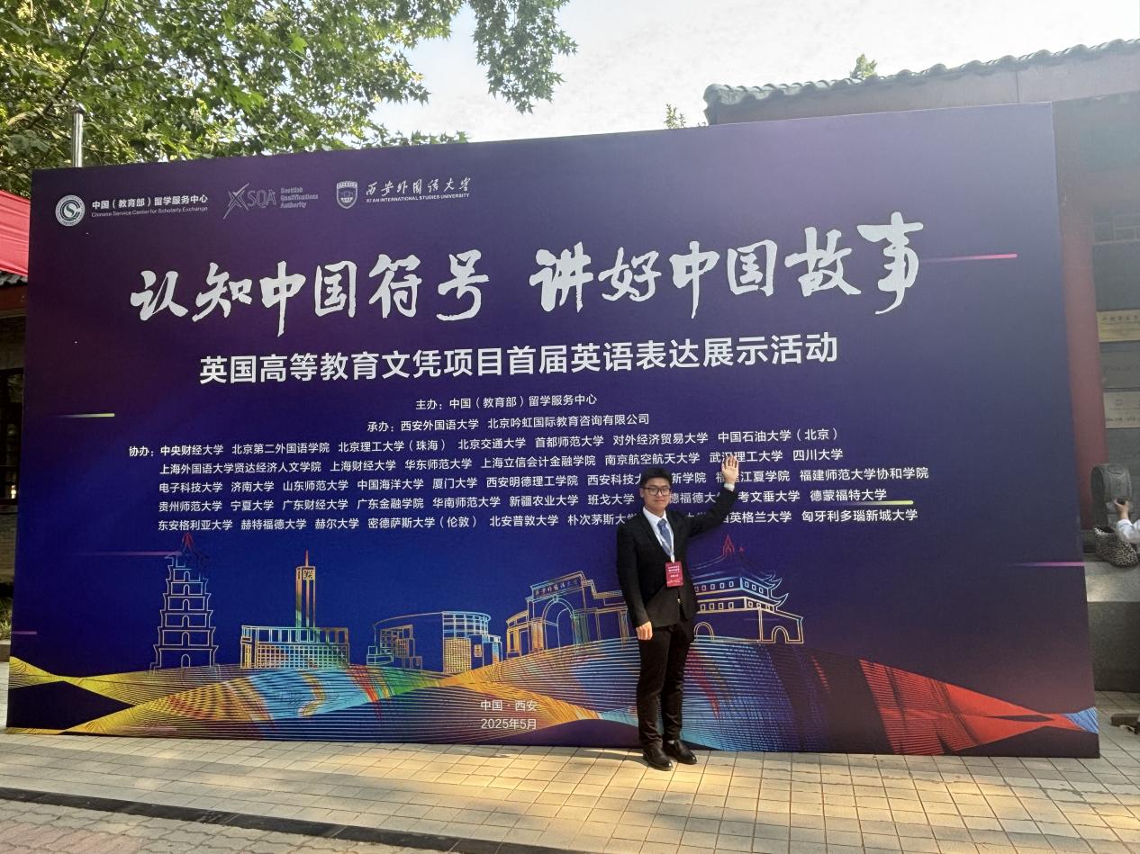 我院曲尚友同学在多轮选拔中脱颖而出,成功晋级首届“认知中国符号,讲好中国故事”英国高等教育文凭项目英语表达展示活动决赛。这场决赛于5月23至26日在西安外国语大学精彩上演,由中国(教育部)留学服务中心主办,汇聚了来自29所高校的40名佼佼者。