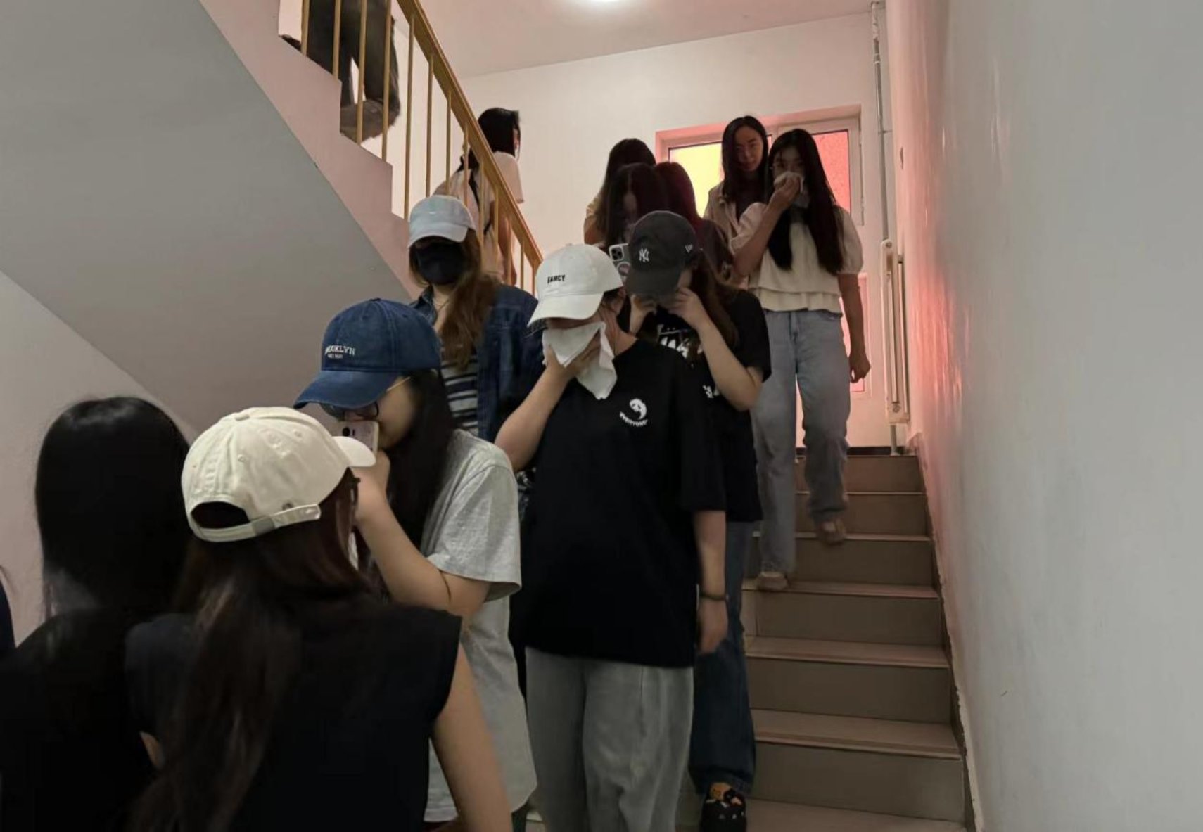 12点30分,由领导小组下达演练开始命令,警笛声响起并在八号楼二层燃放烟零弹,一时间,公寓楼内烟雾弥漫,仿佛置身于真实的火灾场景之中。公寓工作人员利用手摇报警器、喊话器通知各层人员疏散。疏散组打开所有疏散门,在引导员的镇定指挥下,所有学生用湿毛巾捂住口鼻,弯腰低姿,按照既定的疏散路线,紧张而有序地撤离到安全地带,各班清点人数并上报。