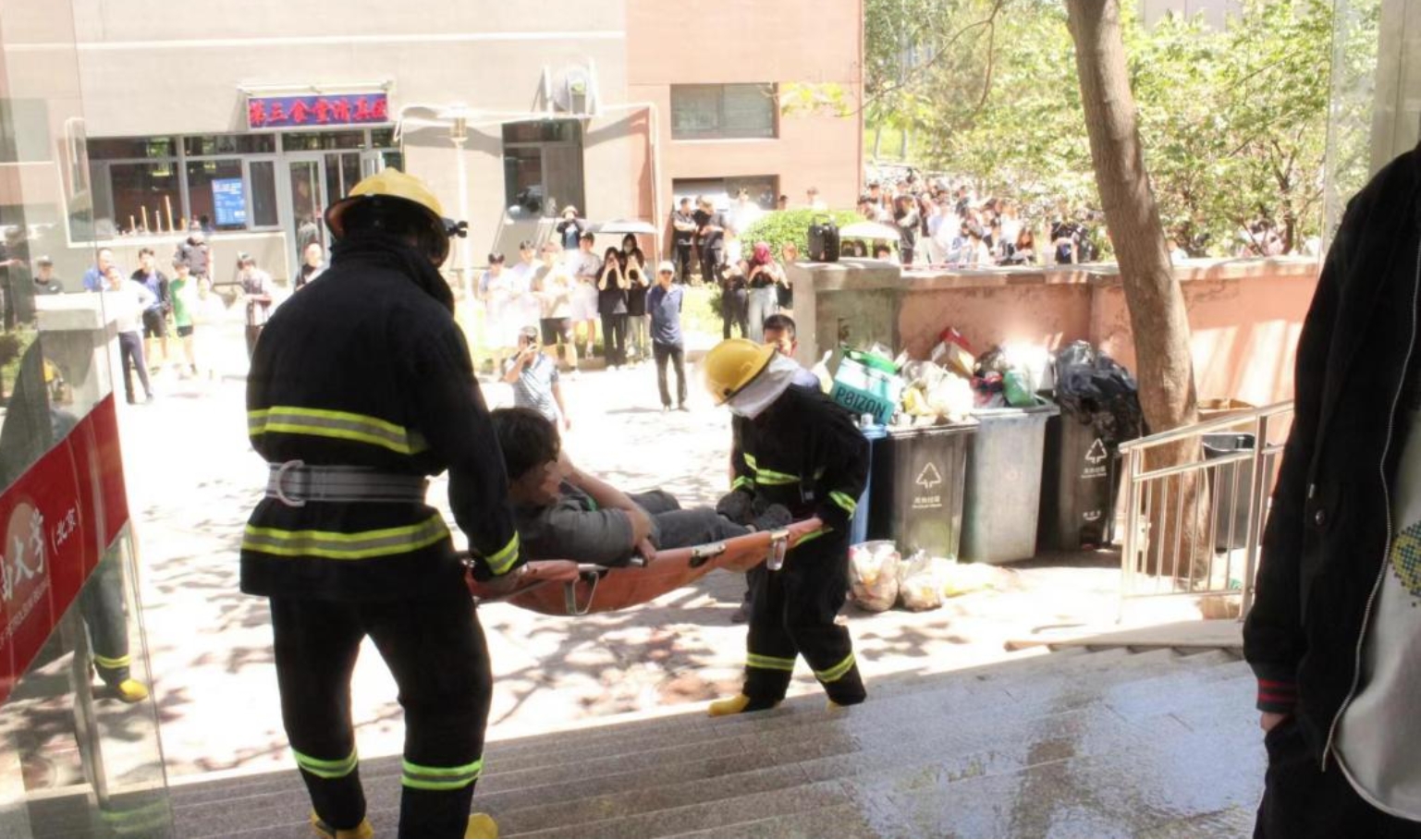 灭火1组乘坐消防三轮车到达现场,手提灭火器,背负空气呼吸器,着消防服赶往火场进行灭火。 灭火2组迅速找到就近消火栓,接好水带,打开开关,进行喷水灭火。救护组负责搬运担架到楼宇内施救。在短短几分钟内,全体师生全部安全疏散完毕,整个过程有条不紊,充分展现了师生们良好的纪律性和应急组织能力。