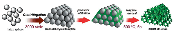 三维有序大孔催化剂具有大孔径和内部贯通的孔道结构等特点,具有宽敞的传输通道,可以有效地降低分子传质阻力,在PM催化燃烧方面具有独特的优势。因此,设计制备具有三维有序大孔结构的催化剂用于催化炭黑颗粒燃烧是第二个关键问题。