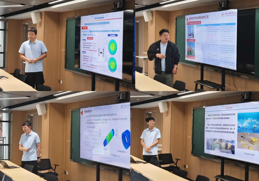 派驻研究生刘文泽、李成刚、徐可奕、李浩泉、张雨凡、陈晓、李佳歆、李欣宬分别做《深海核电能源储存与补给系统耐压结构设计进展》《海洋钻井及钻完井工艺、浅水/深水采油树安装工具研究》《18-5/8寸BHT螺纹接头拉伸应力分析、水下管汇系统测试管道设计调研》《水下生产系统泄露风险与控油技术研究》《陆丰古近系岩石力学特性分析、地层大斜度井筒安全密度窗口预测研究》《基于安全屏障的超深水井喷风险防控研究》《井筒内岩屑运移规律及清洁工具研究》《深水双功能“三合一”浅层建井安装工具、深海高效环保膨胀型表层导管研究》主题汇报。