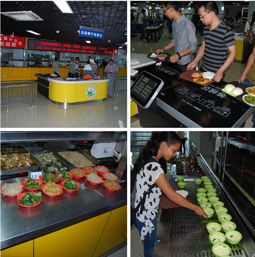 自选餐厅改变过去的窗口售饭方式,学生进入餐厅后进入食品自选区自选饭菜,就餐者可以根据餐盘颜色选择不同价位的饭菜,在自助结算设备上利用餐盘底部的感应芯片进行自助刷卡结算,每人的结账时间仅有1秒,且不会出现算错帐、打错卡的情况,整个消费过程方便快捷,不仅便捷卫生,而且避免了重复刷卡,大大缩短了排队等候的时间。