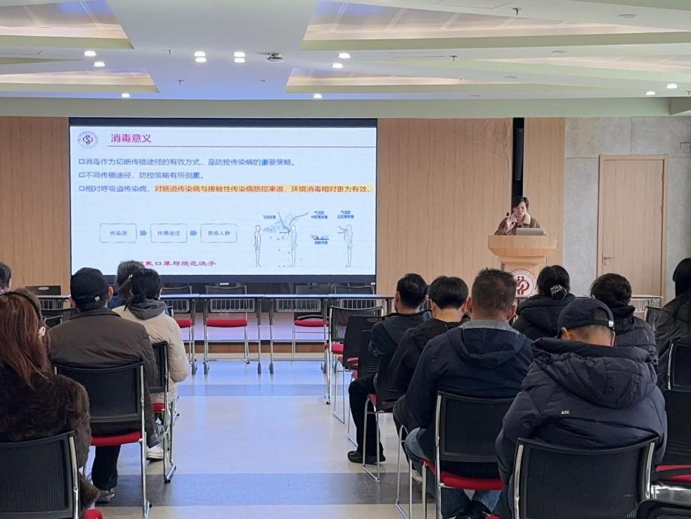 会上,朱建伟介绍了校园常见呼吸道与肠道传染病相关知识,继而针对水痘、带状疱疹、流行性感冒、肺结核、诺如病毒感染等高校常发传染病,系统讲解其病毒特性、临床表现、治疗方式及预防要点。通过结合诺如病毒传染性强、传播快、易在人群密集场所暴发的特点,详细阐释了冬季传染病防控与环境消杀管理的核心要求。