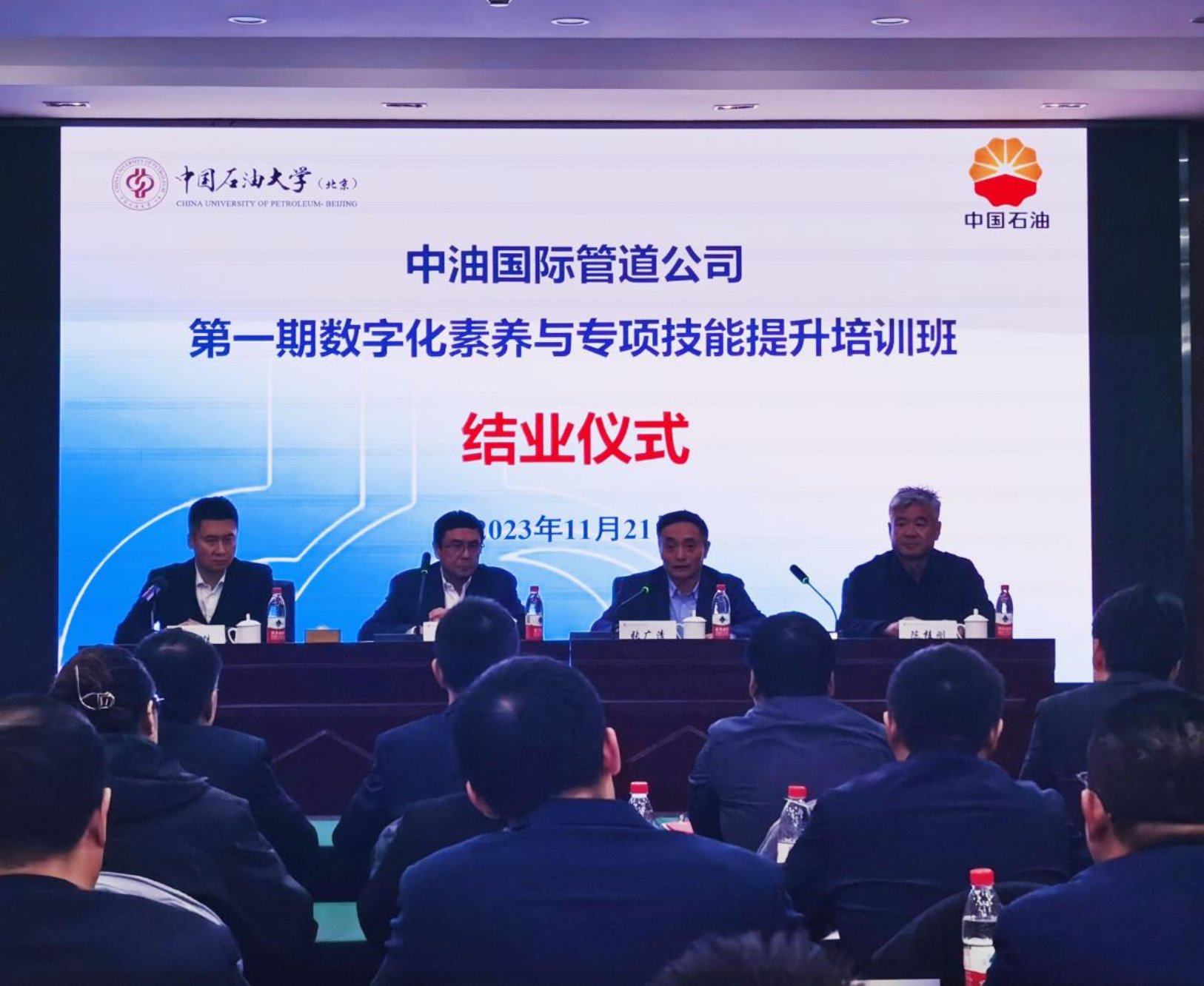 11月21日下午,中油国际管道公司第一期数字化素养与专项技能提升培训班在凤山培训基地举行结业仪式。中油国际管道公司执行董事、党委书记钟凡,中油国际管道公司信息中心主任王铁,中国石油大学(北京)副校长张广清和网络与继续教育学院院长陈桂刚出席结业式并讲话。