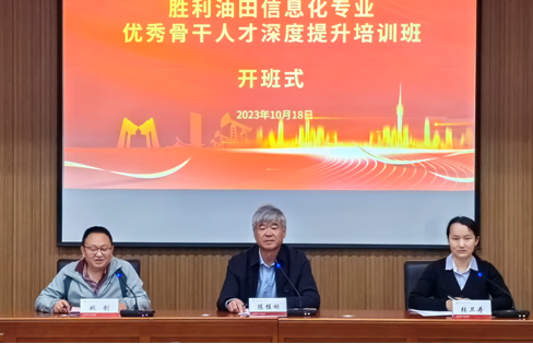 2023年10月18日上午,由中国石油大学(北京)承办的胜利油田信息化专业优秀骨干人才深度提升培训班顺利开班。中国石油大学(北京)网络与继续教育学院院长陈桂刚、胜利油田信息化管理中心高级主管姚剑出席开班仪式并讲话。31名来自胜利油田各单位的信息化专业优秀骨干人才参加此次培训。