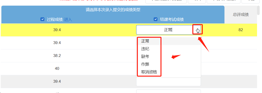 按钮,可以选择非正常的考试情况,例如缓考、旷考等。(在系统中缓考申请成功的学生,结课考试成绩会自动更新为“缓考”状态)