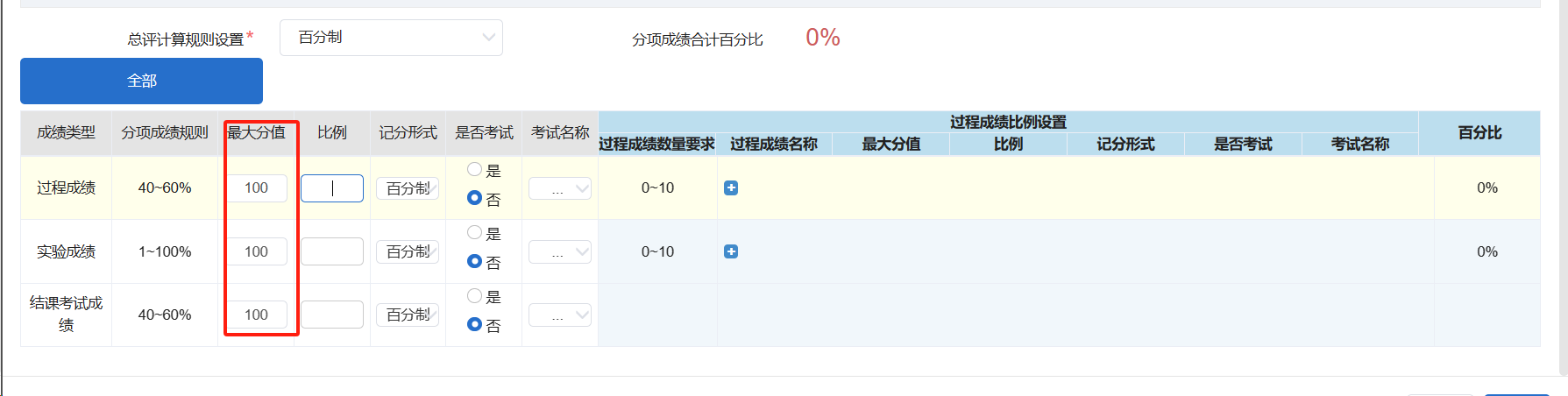 (2)最大分值:百分制成绩默认显示100,设置比例后,系统会自动根据录入的比例计算过程成绩的最大分值并显示。