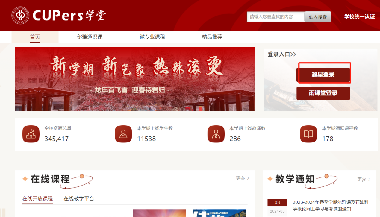 2.使用中国石油大学(北京)网络学习平台,进入CUPers学堂(http://cup.fy.chaoxing.com/),选择“超星登录”,点击“新用户注册”,输入手机号获取验证码,并设置登录密码,然后点击下一步进入完善信息界面,输入学号和真实姓名,点击下一步完成注册登录,然后进入个人空间。后续登录可以选择手机号+密码或者手机号+验证码的方式登录。