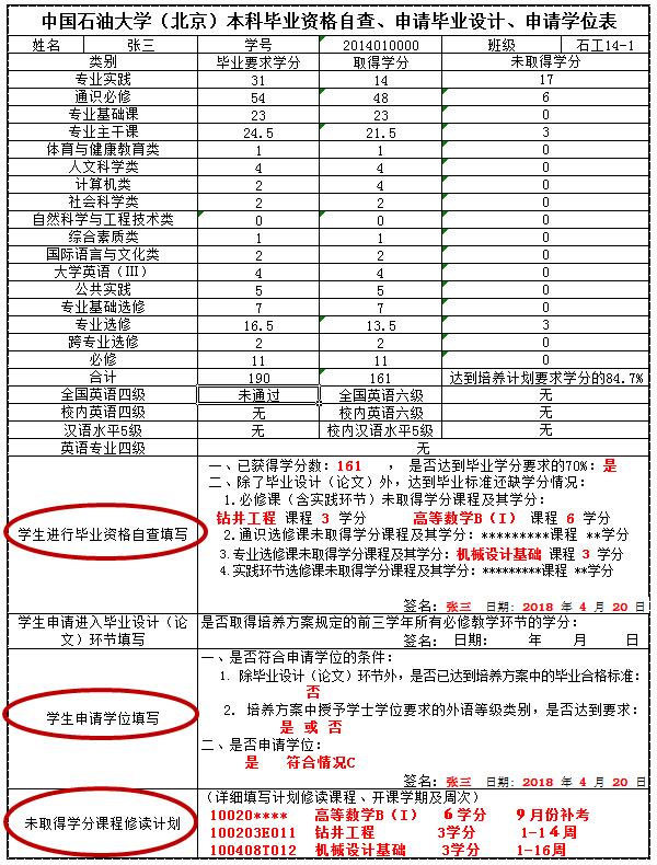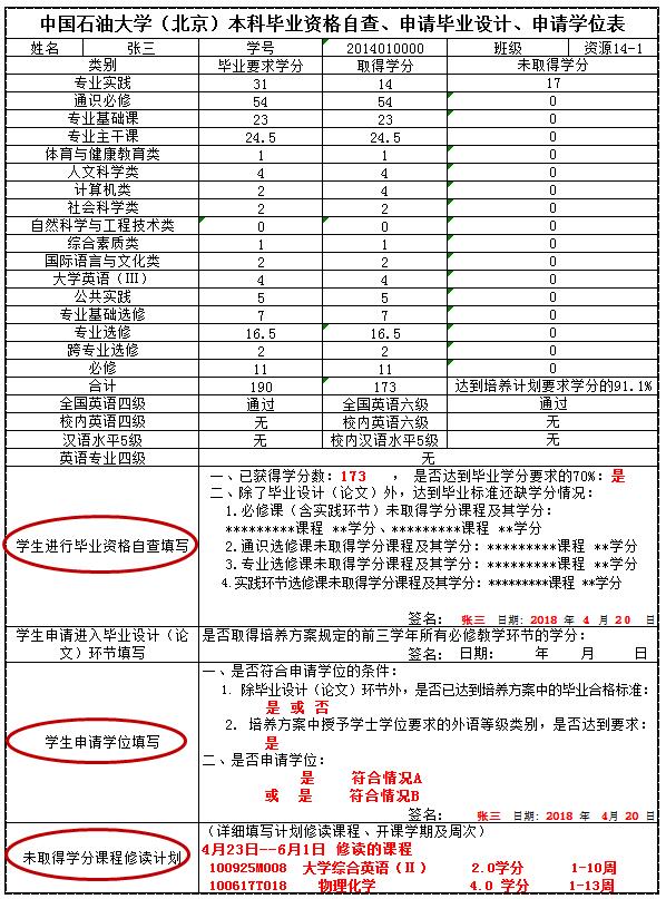 根据所取得学分,将本人符合的学位申请情况填写在“学生申请学位填写”栏,打印后本人签名确认于4月23日前交至辅导员,由辅导员统一交学院院办。申请学位样表见附件。