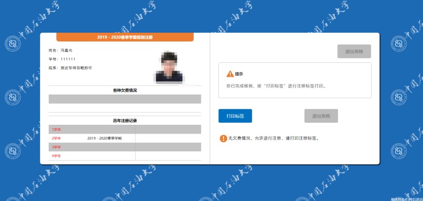 人脸识别成功后,点击“打印标签”, 成功打印后,将中间标签撕下,贴在学生证相应的学期,代表本学期注册完成。