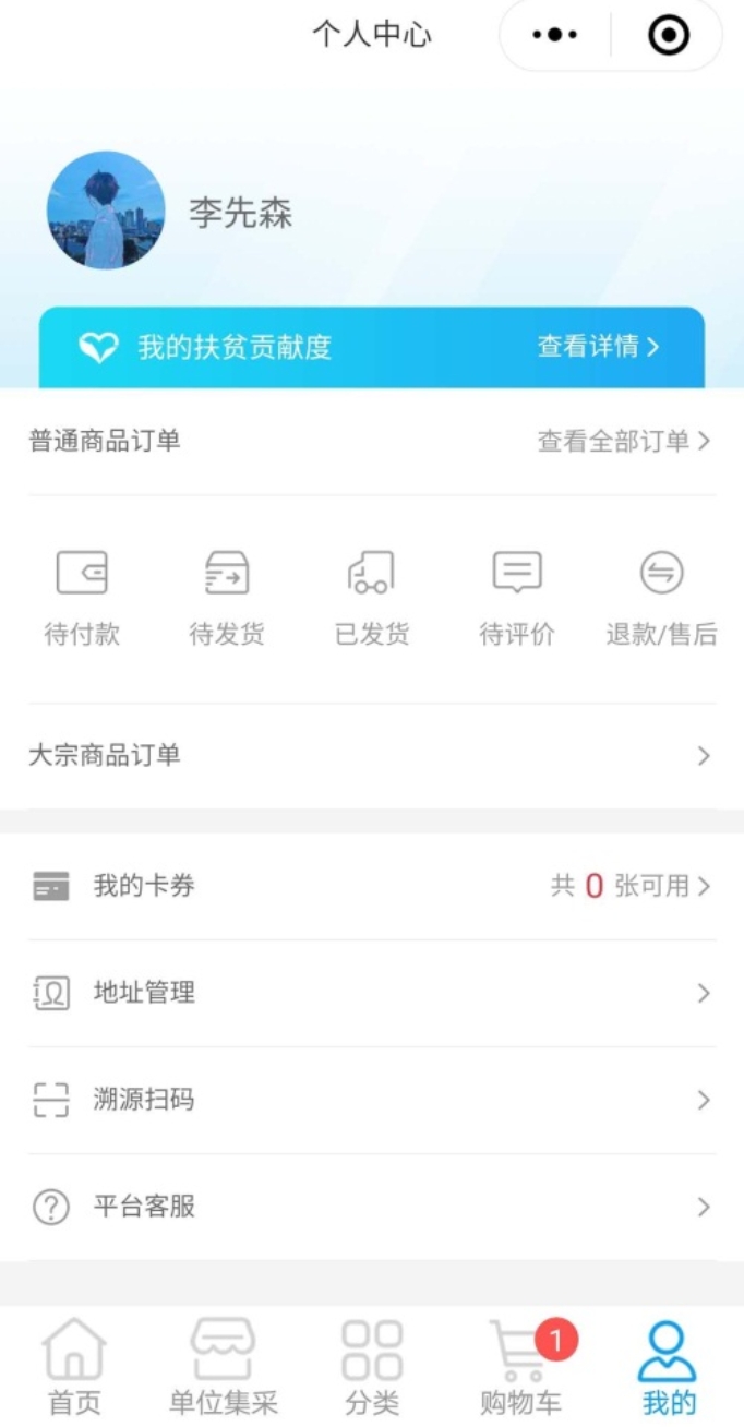 3.订单完成后,可查看扶贫贡献度:点击“我的”进入个人中心界面,点击“我的扶贫贡献度”,购买1元为1积分。