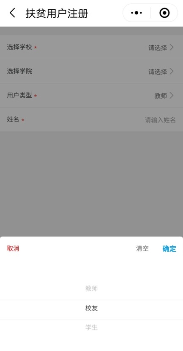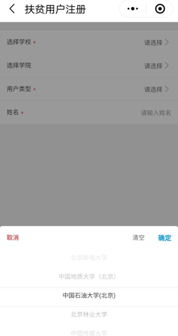 3.选择“用户类型”,可以为教师、校友或者学生。选择学校为中国石油大学(北京)。(绑定学校才可以为学校贡献扶贫积分。)