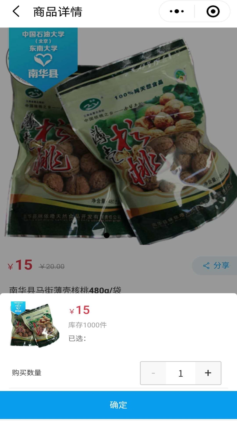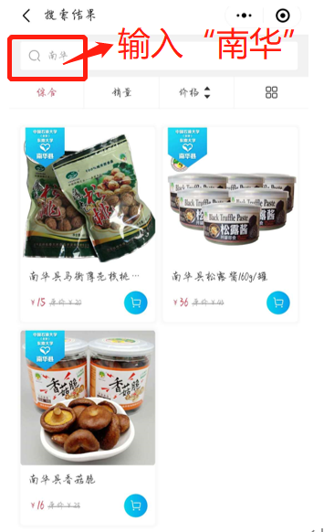 1.返回小程序首页,搜索框中输入“南华”,出现南华县农产品页面。(购买的是南华县产品)