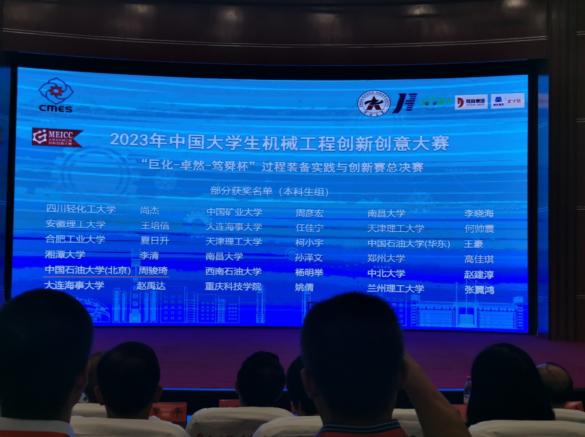 2023年8月26日,中国大学生机械工程创新创意大赛——“巨化-卓然-笃舜杯”第十四届过程装备实践与创新大赛全国总决赛在郑州大学落下帷幕。该比赛为过程装备与控制工程专业的核心赛事,我校在本次大赛中斩获全国总决赛一等奖、二等奖和三等奖各2项。机械与储运工程学院过程装备系周宇航、李森、程修福、王玉平组成的研究生组(指导教师:陈建义),周骏琦、杨溢、秦柯禹、刘世强组成的本科生组(指导教师:李岩),双双斩获全国总决赛一等奖。为了更好地展示作品的实力和水平,过程装备系特邀魏耀东教授作为现场带队教师参加大赛。