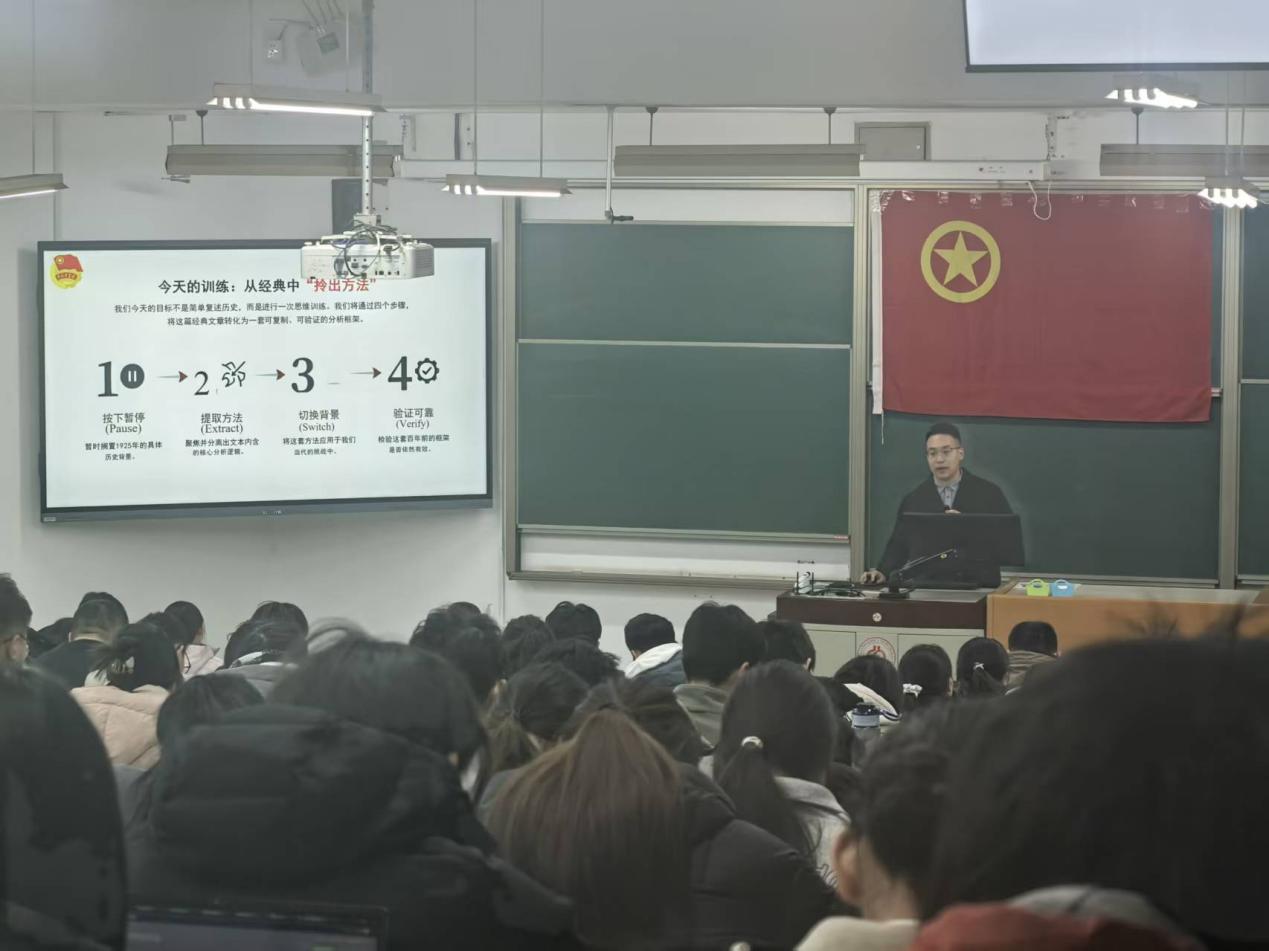 安全与海洋工程学院林才涵同学带来《毛泽东选集》精读分享。他以《中国社会各阶级的分析》为切入点,从“毛主席‘教员’称谓的由来”“1925年的时代背景”等角度引入,梳理总结出“暂停、提取方法、切换背景、验证可靠”的经典学习四步法,引导学员跳出理论记忆,学会从经典著作中汲取解决现实问题的智慧。分享过程中,他聚焦《毛选》中的辩证思维与实践方法,探讨其在当下学习、工作中的现实意义,推动红色经典智慧真正转化为学员的成长动力。