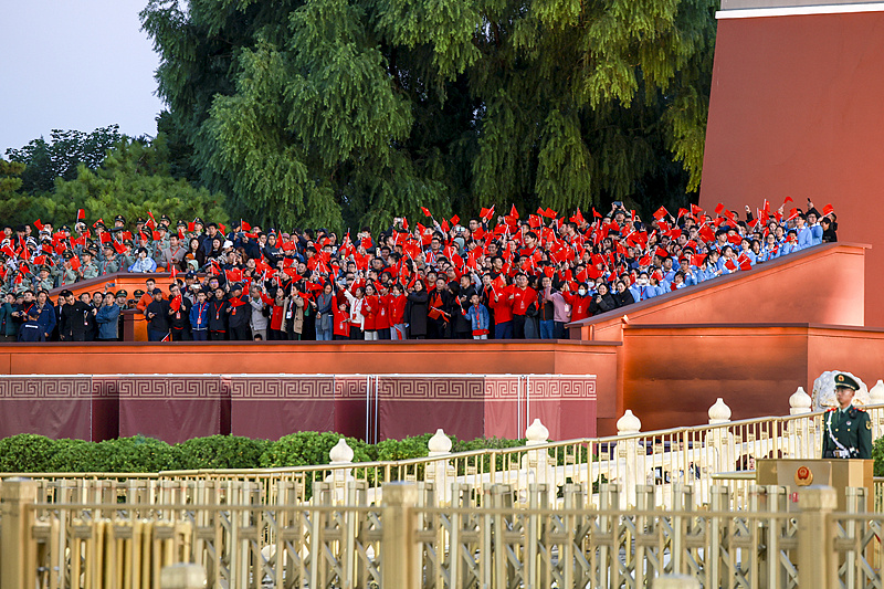 中国农业大学经济管理学院大二学生 蔡佳庭:在这里有一种归属感,没有想象中一个人、几个人在这儿等的那种寂寞。你一进入到这个广场之后,你就会感觉到,大家都拿着红旗,都朝一个地方看,感觉自己的命运和祖国牢牢绑定在了一起,让人感觉到一种深深的归属感和认同感。