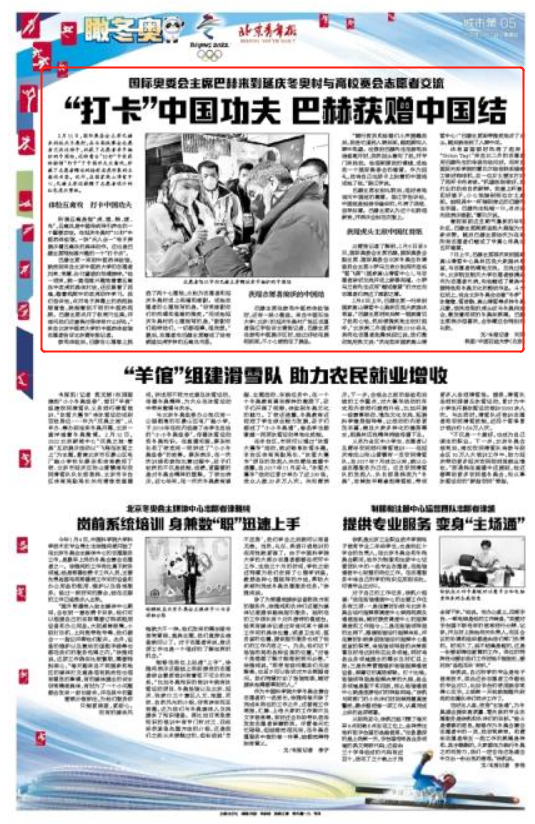 2月11日,国际奥委会主席巴赫来到延庆冬奥村,在与高校赛会志愿者交流过程中,收获了志愿者亲手编织的中国结,还特意去“10秒”中医药体验馆“打卡”了中国功夫五禽戏,珍藏了志愿者赠送的绘有老虎形象的五禽戏书签。此外,在国家高山滑雪中心,巴赫主席还获赠了志愿者设计的红色虎头剪纸。