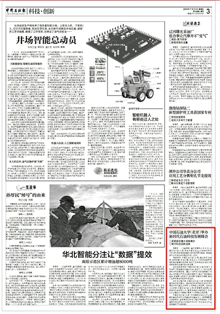 7月13日出版的《中国石油报》第3版以“中国石油大学(北京)举办新时代石油科技发展峰会”为题对新时代石油科技发展峰会暨石油科技成果对接会进行了报道