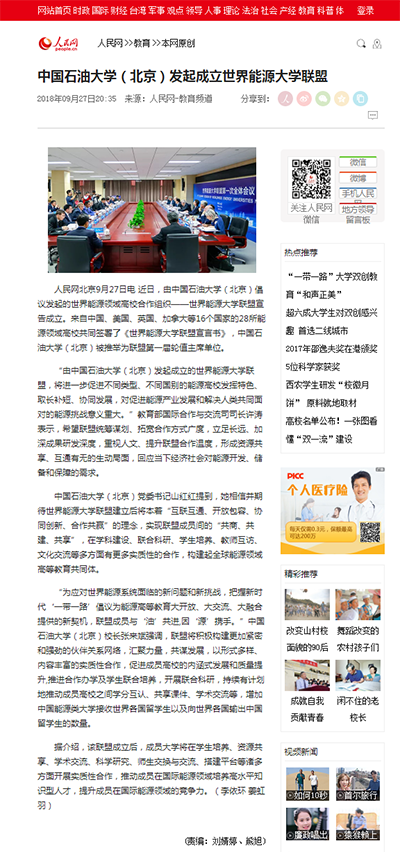 人民网教育频道9月27日以“中国石油大学(北京)发起成立世界能源大学联盟”
