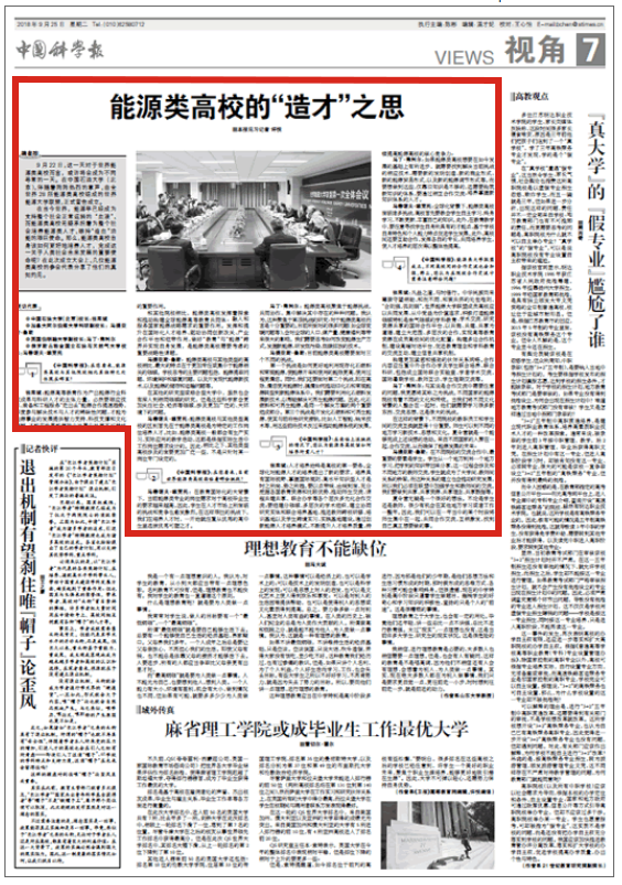 9月25日出版的中国科学报在“视角”版头条以“能源类高校‘造才’之思”为题深度报道世界能源大学联盟成员高校校长、副校长畅谈能源类高校自身该如何更好地培养人才