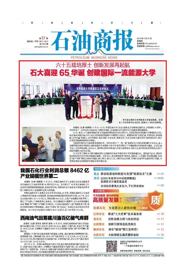 9月27日出版的石油商报在头版头条位置以“六十五载培厚土 创新发展再起航——石大喜迎65华诞 创建国际一流能源大学”报道世界能源大学联盟成立及65周年校庆系列活动