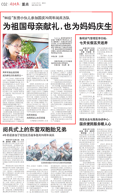 10月13日,齐鲁晚报C3版以《为祖国母亲献礼,也为妈妈庆生》为题,报道石大2018级本科生王泽康参加国庆群众游行为祖国献礼,为自己母亲庆生的故事。