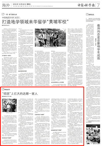 10月30日,中国科学报海外版第七版以《“组团”上石大的达娜一家人》为题,从“中国梦”、“中国情”、“中国家”三个方面讲述了在石大学习的哈萨克斯坦姑娘达娜一家人“组团”上石大的故事。