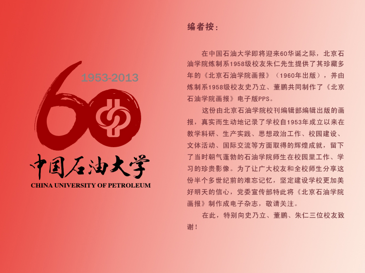 ÔÚÖйúʯÓÍ´óѧ¼´½«ÓÀ´60»ªµ®Ö®¼Ê£¬±±¾©Ê¯ÓÍѧԺÁ¶ÖÆÏµ1958¼¶Ð£ÓÑÖìÈÊÏÈÉúÌṩÁËÆäÕ䲨¶àÄêµÄ¡¶±±¾©Ê¯ÓÍѧԺ»±¨¡·£¨1960Äê³ö°æ£©£¬²¢ÓÉÁ¶ÖÆÏµ1958¼¶Ð£ÓÑÊ·ÄËÁ¢¡¢¶Åô¹²Í¬ÖÆ×÷ÁË¡¶±±¾©Ê¯ÓÍѧԺ»±¨¡·µç×Ó°æPPS¡£ÎªÈùã´óУÓѺÍȫУʦÉú·ÖÏíÕâ·Ý°ë¸ö¶àÊÀ¼ÍǰµÄÄÑÍü¼ÇÒ䣬¼á¶¨½¨ÉèѧУ¸ü¼ÓÃÀºÃÃ÷ÌìµÄÐÅÐÄ£¬µ³Î¯Ðû´«²¿Ìش˽«¡¶±±¾©Ê¯ÓÍѧԺ»±¨¡·ÖÆ×÷³Éµç×ÓÔÓÖ¾£¬¾´Çë¹Ø×¢¡£