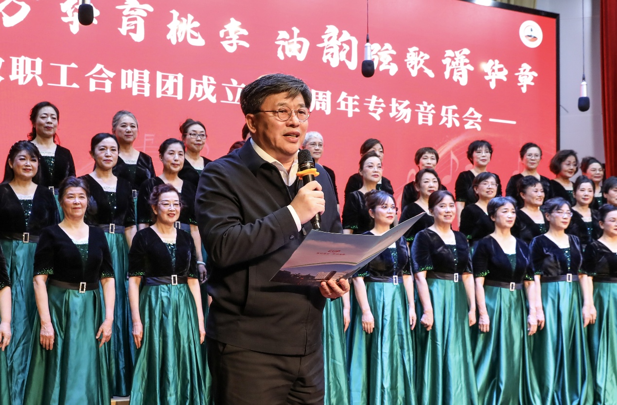 韩克飞向教职工合唱团成立20周年表示祝贺,指出教职工合唱团作为校园文化重要载体,以美育人、以文化人,二十年来生动践行了“讲台育桃李,舞台传薪火”的双重使命。他希望教职工合唱团不忘初心、再接再厉,继续做校园文化的引领者、团结奋进的践行者、学校形象的展示者,为学校高质量发展注入人文力量。他表示,学校将持续关心支持教职工合唱团的建设发展,期待合唱团为学校高质量发展谱写更壮美的和声。