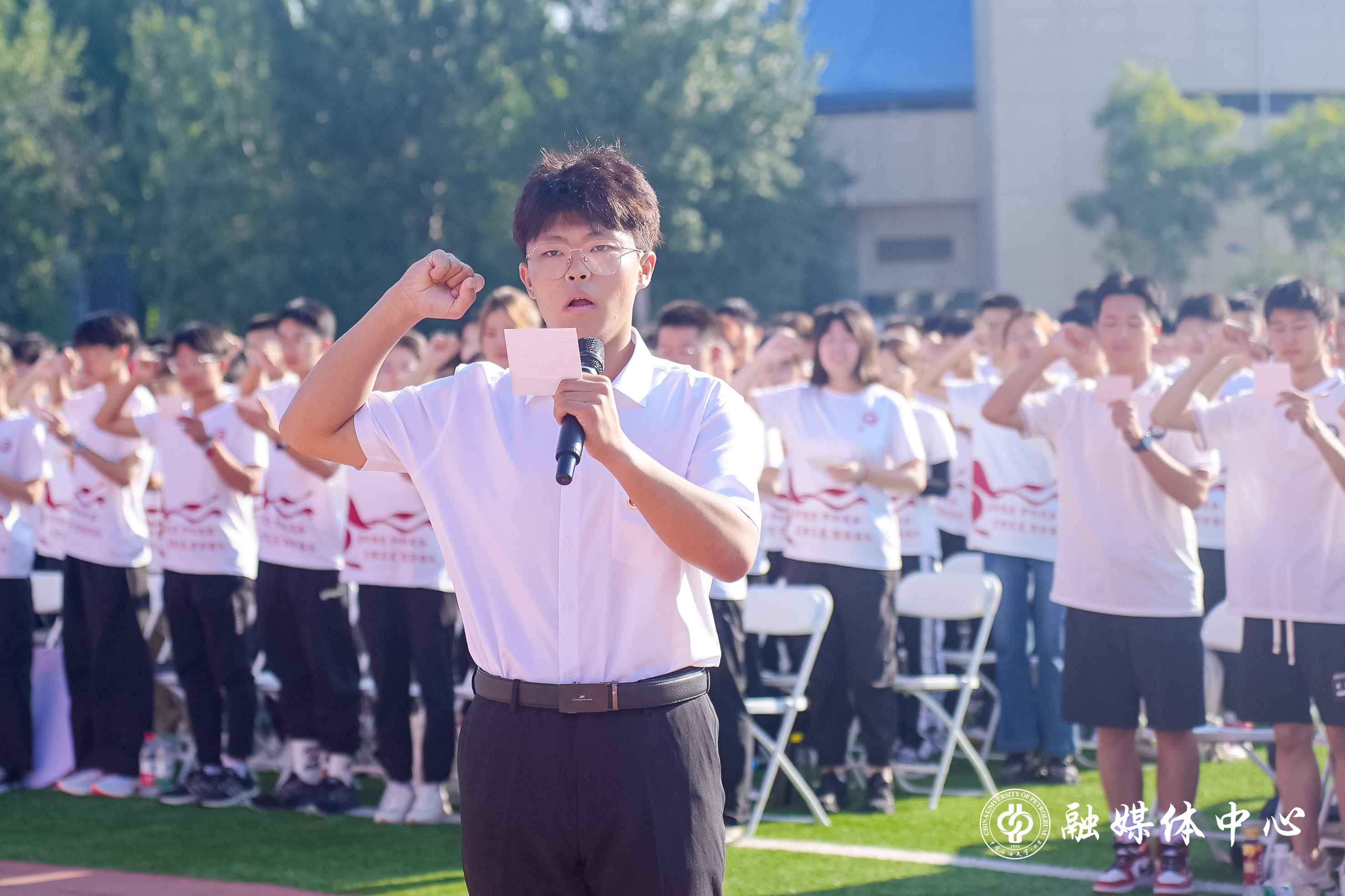 “我宣誓:谨记中石大校训,厚积薄发,开物成务......”在机械与储运工程学院2024级本科生杨人瑞的领誓下,全体新生举起右拳、庄严宣誓,他们用铿锵有力的誓言表达着“能源强国、能源报国”的坚定决心。庄严的誓言声在红旗操场上空久久回荡。