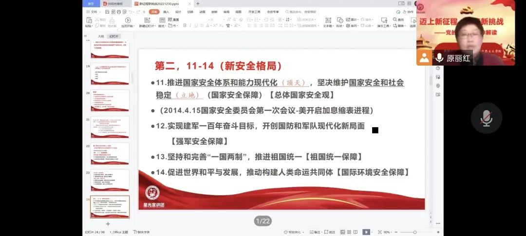 举办宣讲活动深入学。学院各基层党团组织结合实际开展宣讲活动,掀起党的二十大精神学习热潮。学院邀请中国石油大学(华东)马克思主义学院副教授、中国化马克思主义研究中心副主任原丽红作了题为“迈上新征程,迎接新挑战——党的二十大精神解读”的专题报告,结合重大历史事件,深入剖析了党的二十大报告的关键内容,全面解读了党的二十大会议精神。各党团支部结合支部实际,邀请学校二十大精神宣讲团成员开展精神宣讲,系统梳理党的二十大精神内涵,深化会议精神学习。