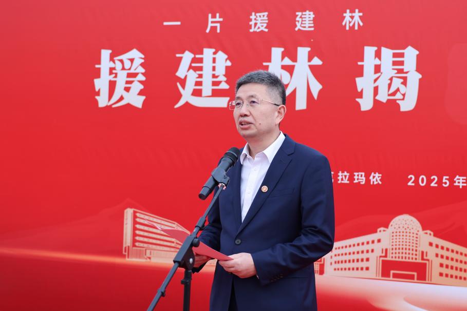 王同奇在主持中表示,这片由援建教师亲手种植的胡杨林,象征着教育援疆事业在这片热土上“落地生根、枝繁叶茂”,更承载着教育援疆的深情厚谊,凝聚着多方共建、校地协同的丰硕成果。援建林揭牌仪式,不仅是一段情谊的“里程碑”,更是一段新征程的“起跑线”。这片援建林,将与所有扎根新疆的教育者一起成长,与服务教育援疆的克拉玛依校区共同奋进,见证西部高等教育振兴之路越走越宽。