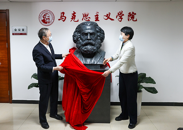 党委书记陈峰、校长吴小林共同为马克思雕塑揭彩,目光深邃的马克思青铜塑像成为马克思主义学院“学马、信马、用马、研马、传马”的精神象征。